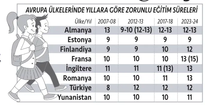 TEDMEM’in raporunda yer alan karşılaştırmalı analizlere göre, 1980’lerden itibaren dünya genelinde zorunlu eğitim süresi artış eğilimi gösteriyor. Fransa, Romanya ve Meksika 13- 15 yıl ile en uzun zorunlu eğitim süresine sahip ülkeler arasında. Türkiye 12 yıllık zorunlu eğitim süresiyle Avrupa’daki örneklerle benzerlik gösteriyor. Finlandiya zorunlu eğitimi 18 yaşına kadar uzatarak erken okul terki oranını yüzde 6’ya indirmiş, çıraklık eğitimine başlama yaşını 15’e kadar indirerek genç işsizliği oranını yüzde 7’nin altına düşürmüş.